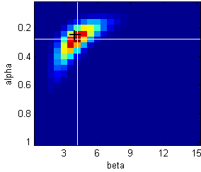 White crosshairs: maximum likelihood (the peak or mode of the distribution)